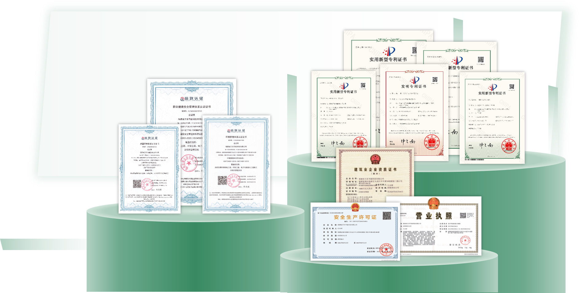 建筑机电安装工程专业承包一级、建筑装修装饰工程一级、电子与智能化工程一级、消防设施工程贰级、环保工程专业承包贰级,质量管理体系认证、环境管理体系认证、职业健康安全管理体系认证。